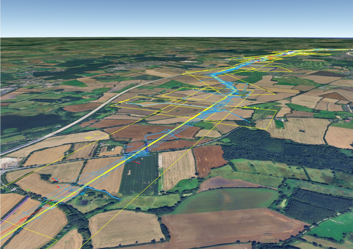 Aufteilung in Einzelflüge: Unter Sichtflugbedingungen kamen verschiedene Drohnen (Multikopter und Flächenflugzeuge) zum Einsatz, wobei die Trassen aufgrund des schwierigen Geländes (z. B. Waldkorridore, unwegsames Terrain) in mehrere Abschnitte unterteilt wurden.